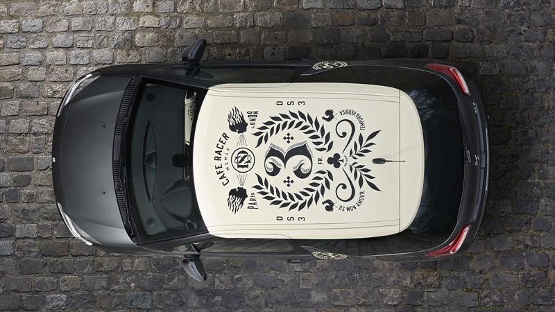 En el exterior se destacan las denominadas DS Wings y las baguetas laterales en color negro opaco, retrovisores en negro y centro de ruedas Crema Parthénon, animación específica Café Racer en laterales y techo, además de llave Café Racer, faros DS LED Vision y llantas 17” Bellone en color negro brillante