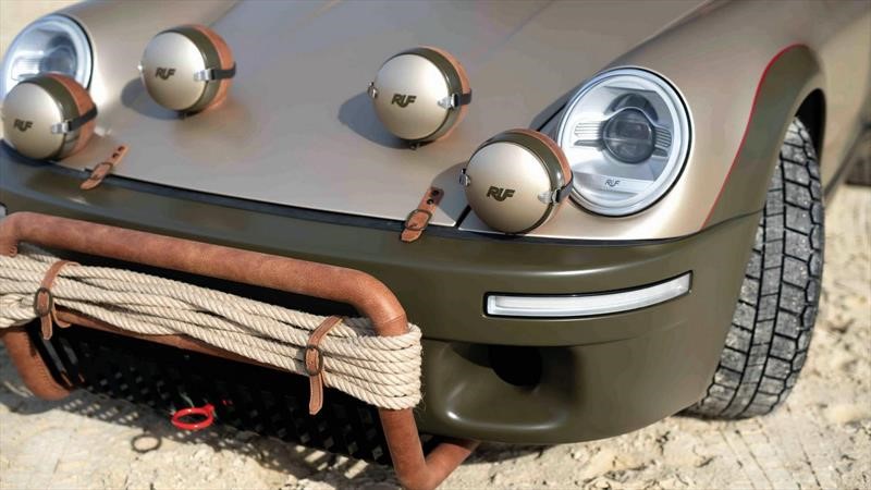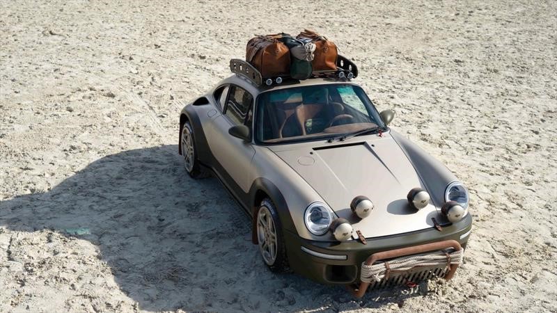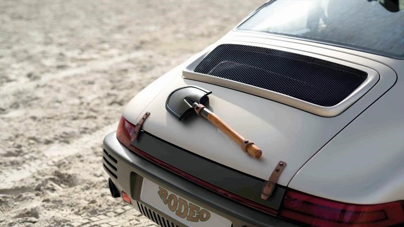 Visualmente, este 911 se destaca por el kit de carrocería con guardabarros más anchos, una defensa delantera dotada de un protector, luces LED sobre el capot, un portaequipaje en el techo, baberos de guardabarros y la pintura bitono. Sin dudas, lo más llamativo está en la tapa del baúl, que sostiene una pala ¿para utilizar en caso de entierro? Quien sabe...