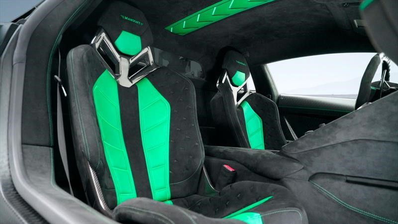 Bautizado como Mansory Cabrera en referencia a una casta de toros española, el superdeportivo cuenta con una carrocería fabricada en fibra de carbono (pintada en color verde), grupo óptico con tecnología LED y un interior personalizado.
