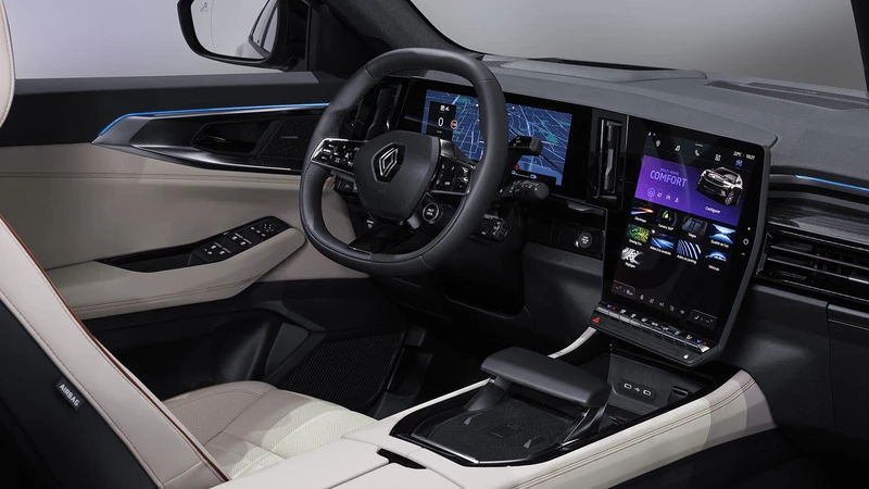 En el frente se destaca la nueva disposición de Renault con dos pantallas unidas, la horizontal de 12,3 pulgadas para instrumental y vertical de 12 pulgadas para multimedia OpenR Link que opera con sistema provisto por Google. Si con eso no alcanzara está pa losibilidad de un HUD (head-up display) de 9,3 pulgadas.