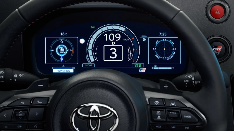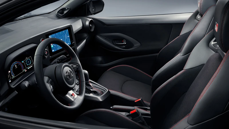 El cambio más notorio del GR Yaris está en el interior con un tablero de formato recto que mira hacia el conductor e integra el equipo multimedia en sus líneas. Más allá de la estética, la marca comenta que mejora la ergonomía reposicionando varios comandos.