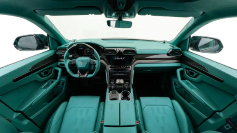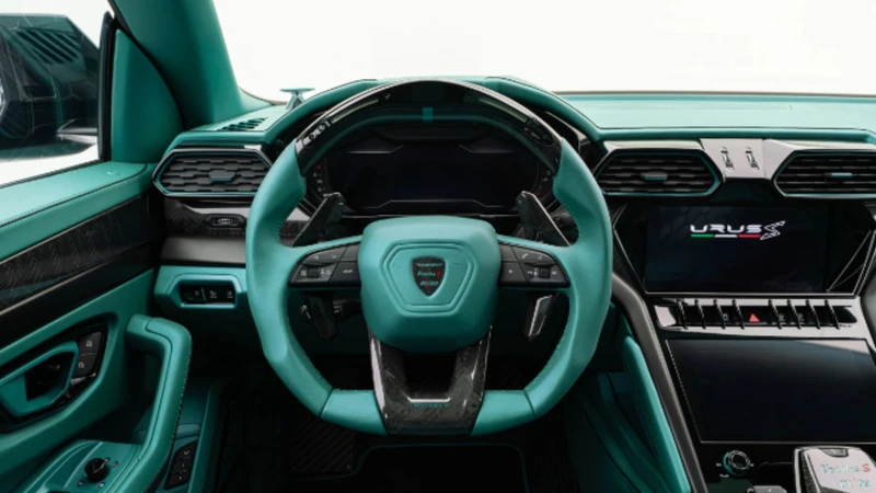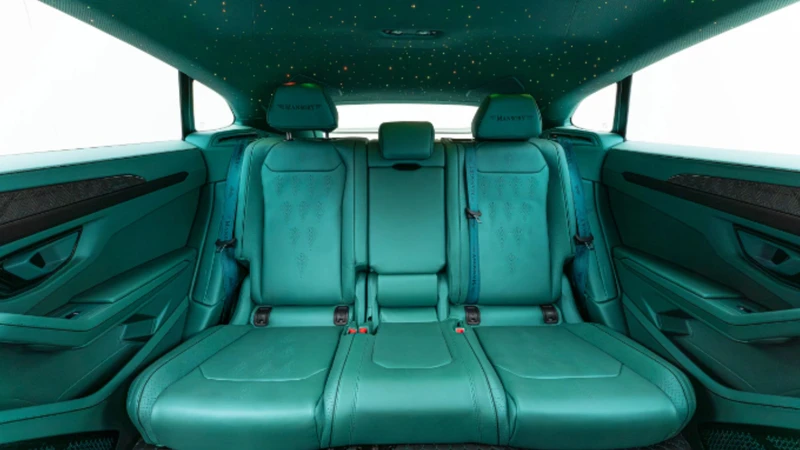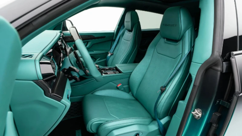 Al igual que en el exterior Mansory hizo lo suyo en la cabina del Urus empezando por el tratamiento cromático en verde rabioso y sumando varios componentes específicos como los cinturones de seguridad, alfombras, botón de arranque y pedales que llevan el símbolo Mansory, ademas de iluminación interna.