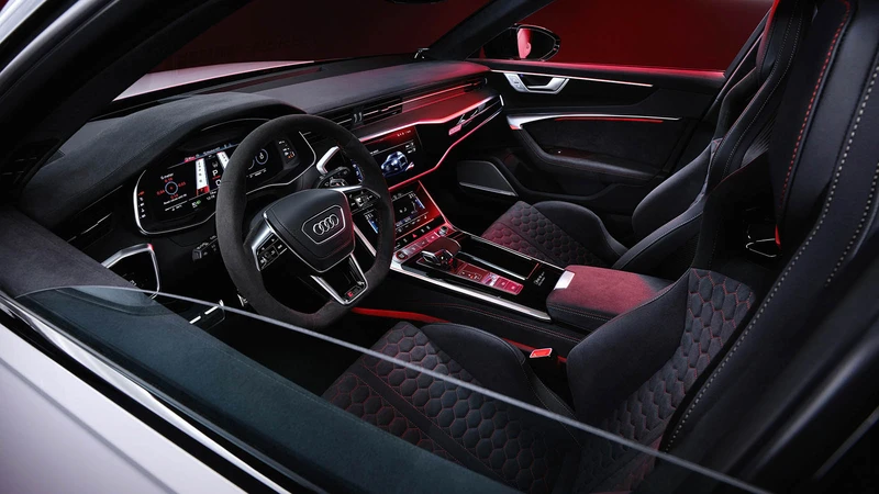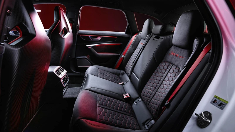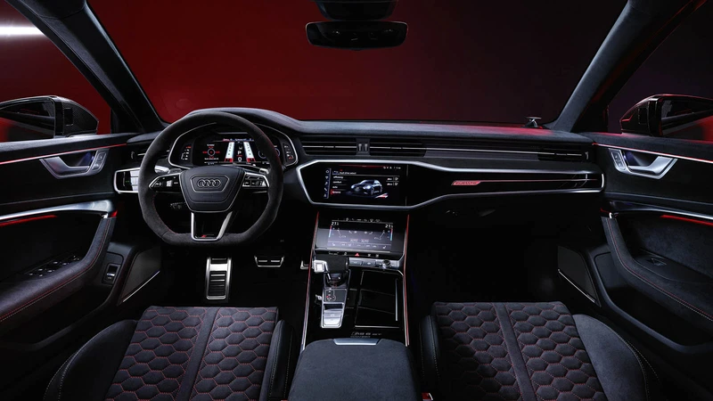 El RS6 GT cuenta el paquete RS Plus en el interior donde predomina el negro tanto en los cueros como en las gamuzas que revisten el tablero, los asientos y las puertas. Hay detalles en rojo y cobre en las costuras.