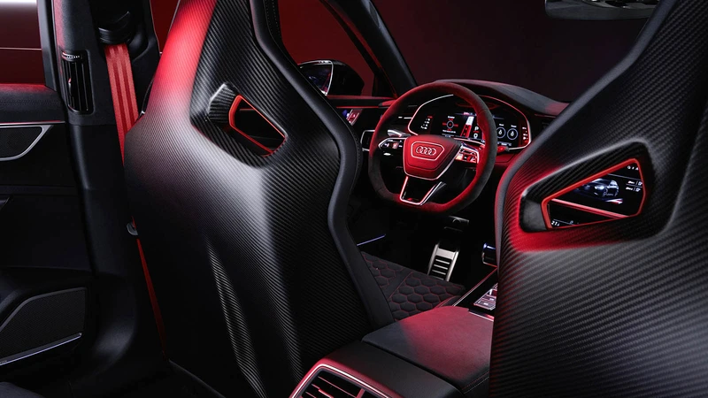 Las butacas deportivas ofrecen respaldo en fibra de carbono, logos estampados y diseño tipo panal, con cinturones de seguridad en color rojo. Audi ofrecerá terminaciones en fibra de carbono expuesta.