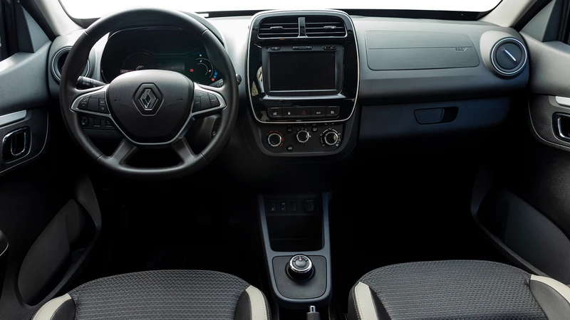 Puertas adentro, el Kwid a baterías no presenta cambios mayores, pero estrena un tablero compuesto por una computadora de abordo digital e indicadores de entrega de potencia, frenado regenerativo y medidor de batería disponible. La diferencia más notoria es la selectora de tipo "ruedita" en vez de la palanca convencional.