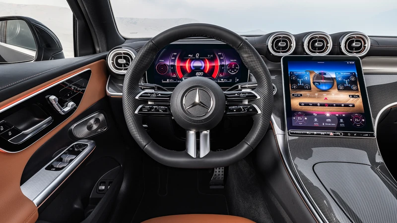 Dentro de los elementos destacados de esta GLC 300, están el techo corredizo panorámico, dos pantallas: una de 12,3” para el tablero y una en la consola central de 11,9”; y además cuenta con butacas calefaccionadas para el conductor y pasajero, y unos comandos flotantes para la apertura de puertas y los ajustes de los asientos. El baúl es de 545 litros.