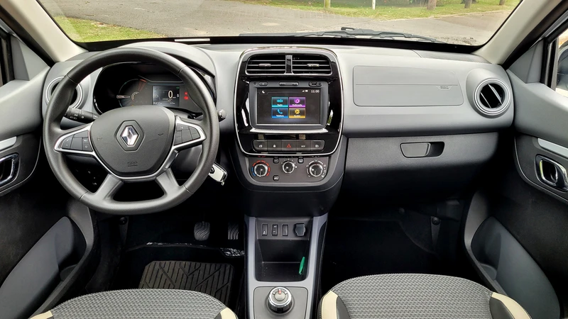 El pequeño Renault viene con lo básico e indispensable. Podés ver el equipamiento del E-Kwid en el Catálogo de Autocosmos con el precio actualizado, acá voy a destacar las ventanillas y retrovisores eléctricos, aire acondicionado, multimedia de 7” y cámara de retroceso.