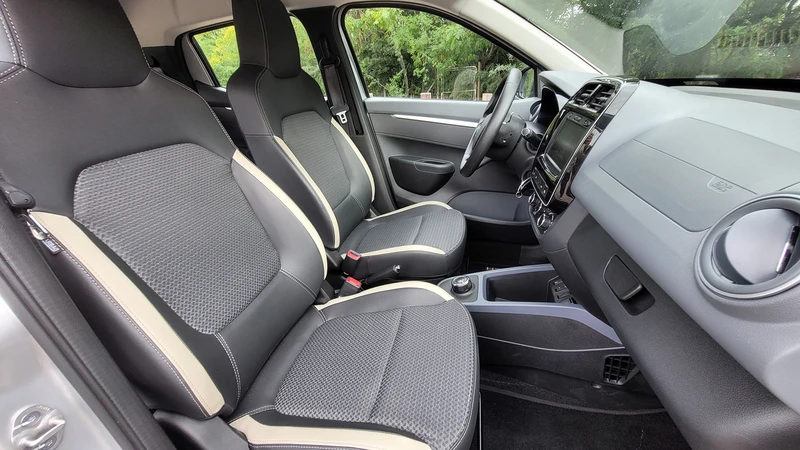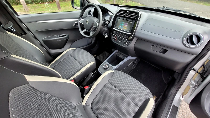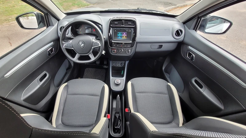 En la cabina el Kwid es más o menos el mismo auto que solíamos conocer, mismo tablero, plásticos duros al tacto, pero que se sienten sólidos, pocos decorados, destacándose el aplique en negro piano que envuelve la parte central.
