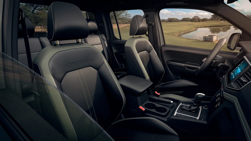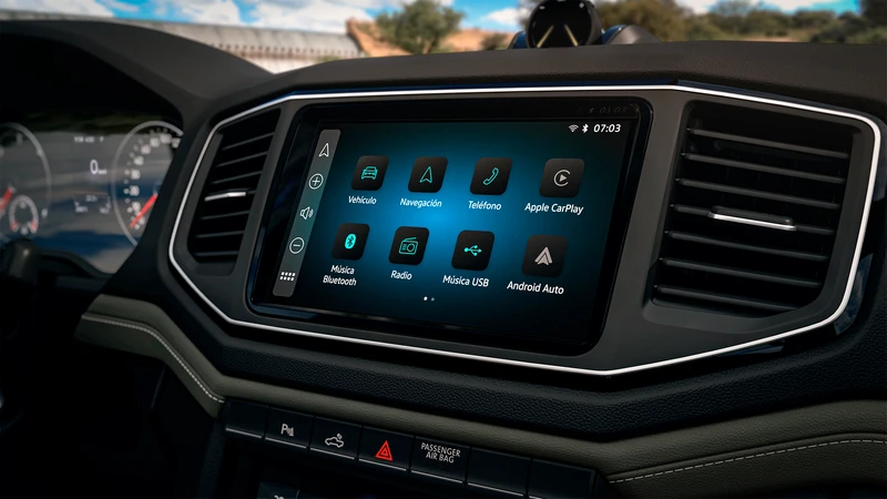 Puertas adentro de la Amarok 2025, no hay grandes cambios, pero lo más destacado es la pantalla “Composition Touch” de 9 pulgadas, con Apple Car Play y Android Auto, que está disponible en toda la gama, además del nuevo diseño de las butacas.