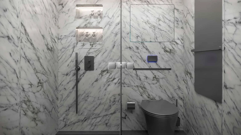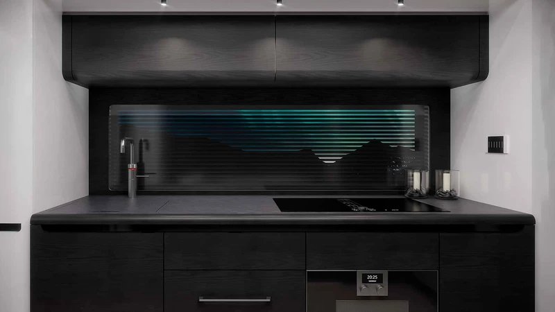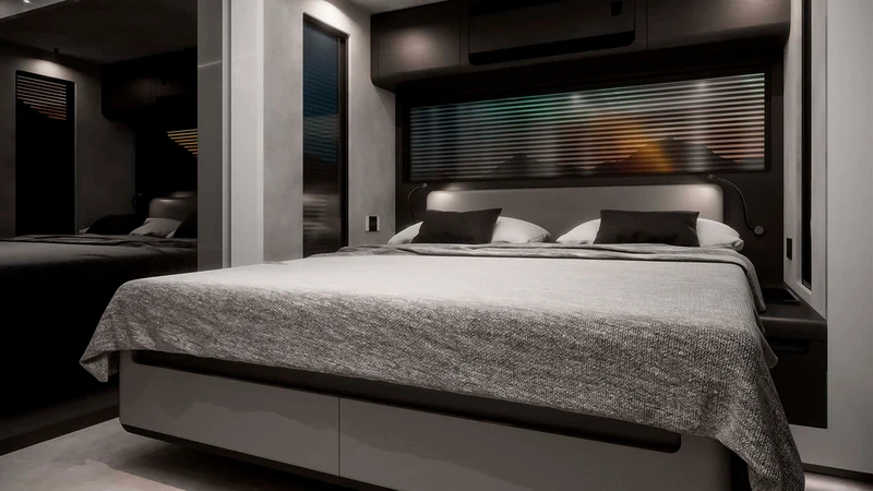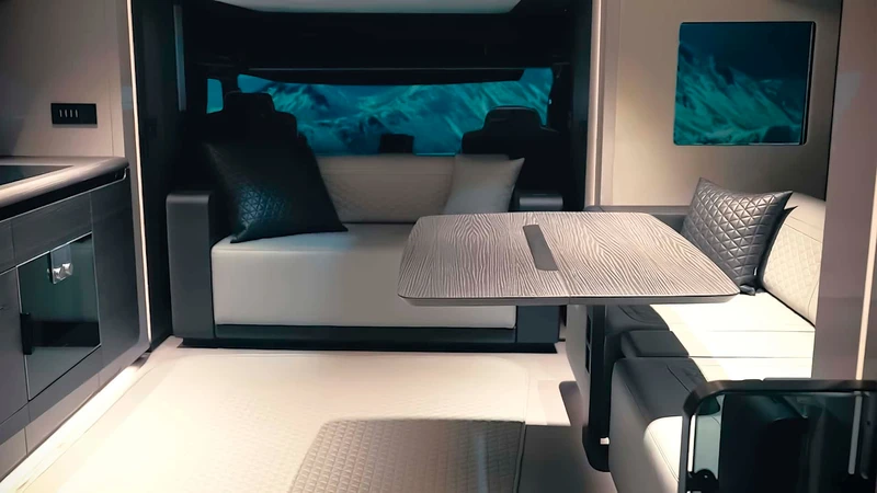 Puertas adentro, el Big Boy 1200 es una mansión rodante: cuenta con más de 30 m2 de habitabilidad, y podemos ver todo tipo de terminaciones y materiales, incluyendo fibra de carbono, madera negra, alcántara, cuero, y más.