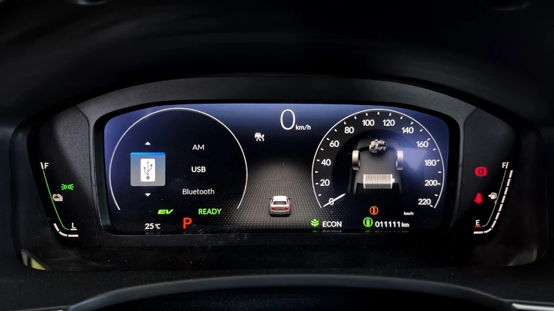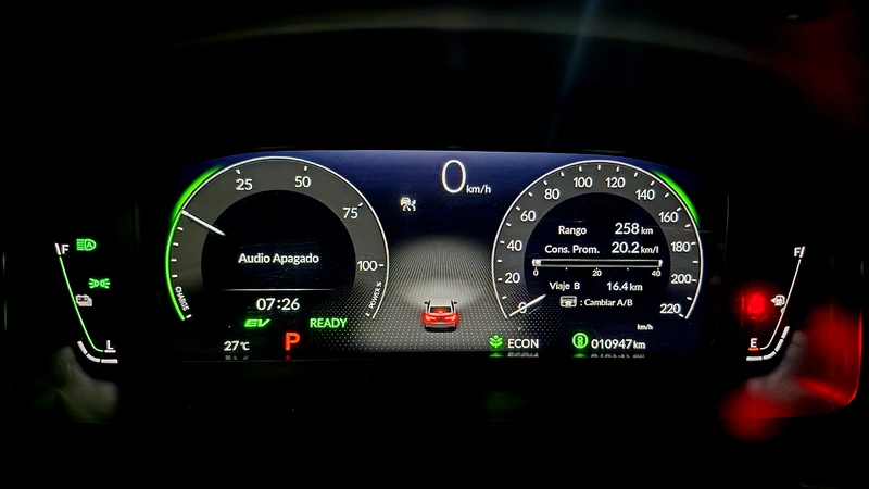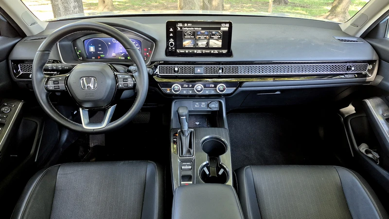 Curiosamente para tanto despliegue de tecnología, la selectora es super convencional. Ponés D y el Civic e:HEV se pone en marcha suave y silenciosamente con el motor eléctrico, emitiendo como único sonido la música obligatoria en este tipo de autos para que los peatones lo escuchen venir a bajas velocidades. Ojo, el motor de combustión puede encenderse si hace falta cargar la batería, pero (casi) siempre se va a mover con electricidad.
