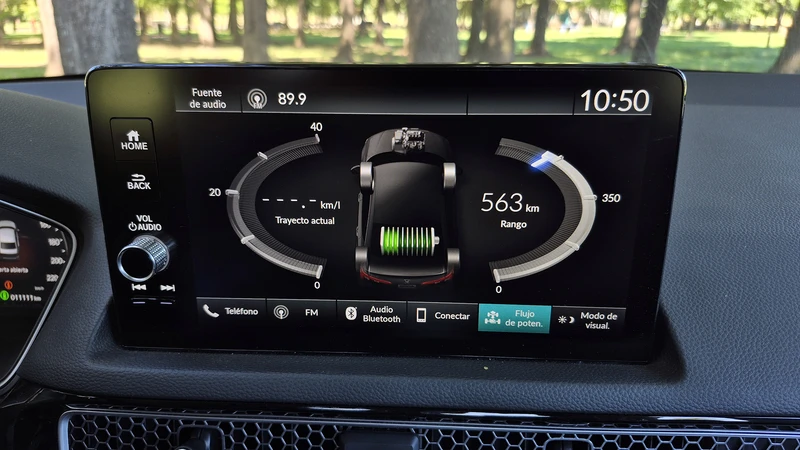 Como prodrás ver esos 315 Nm instantáneos son contundentes cuando pisás el acelerador a fondo. Otra peculiaridad del Civic, que lo separa del sistema ePower de Nissan, es la posibilidad de empalmar el motor de combustión casi directamente a las ruedas, algo que te muestra con un engranajito en el diagrama de flujos de la pantalla.