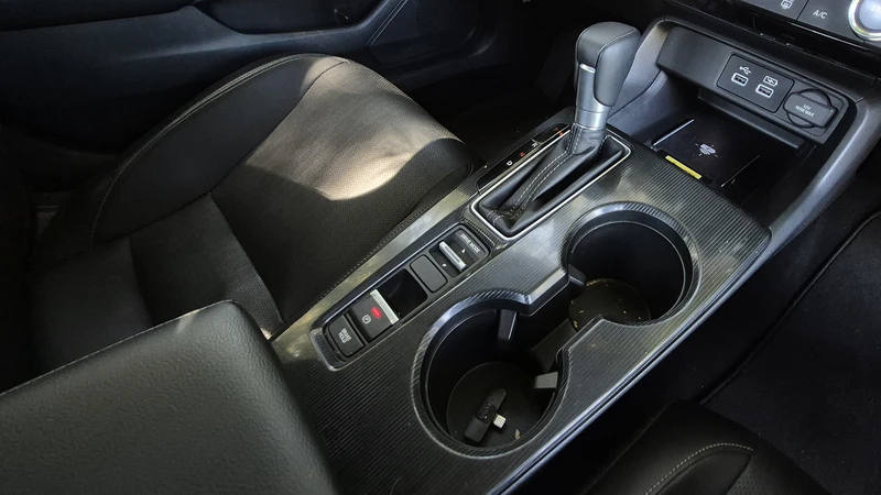 Si bien hay algunos decorados en negro brillante, el interior del Civic e:HEV es extremadamente sobrio, especialmente en el recubrimiento de la consola central con una textura como rayada. La calidad de materiales es buena, y todo se siente más que sólidamente unido.