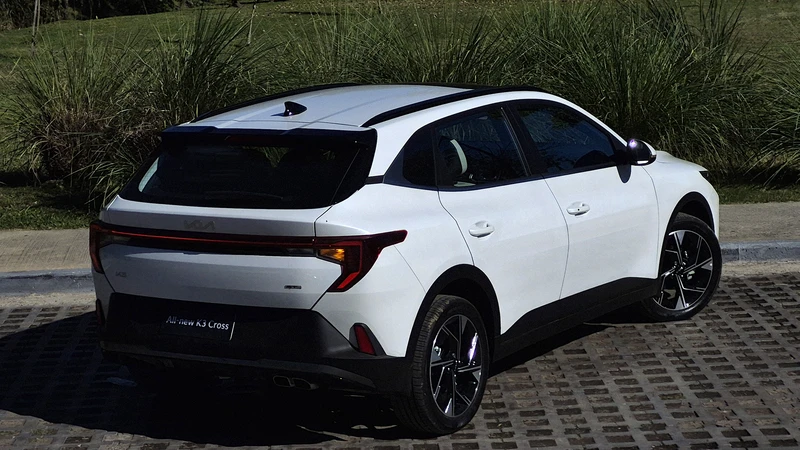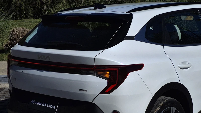 El lateral del K3 Cross es bastante tradicional hasta el pilar trasero lanzado, con friso satinado y una suerte de cola de pato que remite a los modelos eléctricos de la marca. Rematan las nuevas luces de Kia en forma de colmillos dobles hacia abajo y los laterales, que está interconectadas con barra LED.