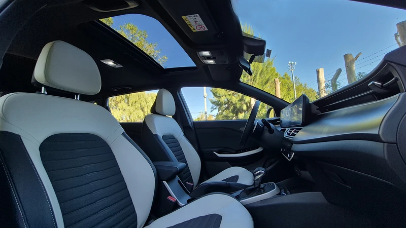 Los plásticos son duros al tacto, pero sólidos, y se siente la prolijidad y fortaleza de encastres. Hay algunos decorados metalizados como los que envuelven el domo de cambios, y afortunadamente está acotado el uso del negro piano. Un punto aparte merece el volante que tiene dos radios gruesos y un decorado específico en la parte baja. Remata la combinación de tela y cuero, tanto en butacas como en contrapuertas y la pedalera en metal de la unidad probada GT Line.