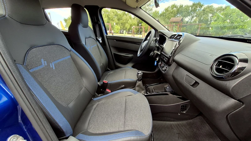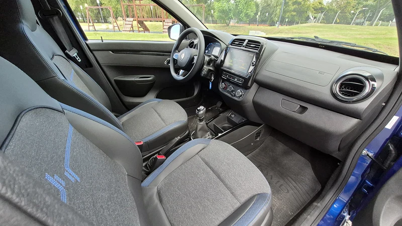 En la cabina del Kwidsito se mantiene casi todo inalterado, pero con algunos cambios. Los asientos con cabezal incorporado tienen nuevo tapizados con cuerina, además de secciones y costuras en azul, pero lo más interesante está en la pantalla central.