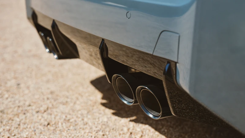 En la parte trasera, se destacan elementos como los escapes cuádruples (dos de cada lado), las ópticas oscurecidas, un difusor más prominente y un spoiler que se asoma en la parte superior de la tapa del baúl.