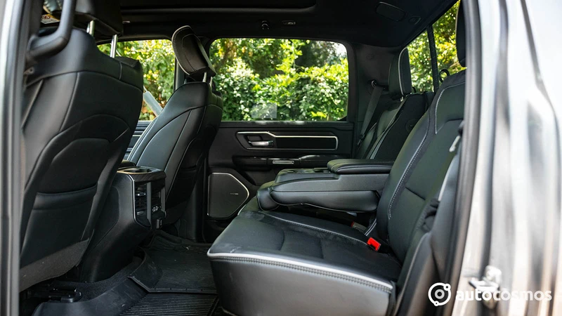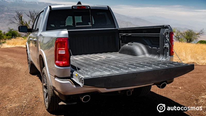 Atrás hay cambios menores en las luces, insignias más grandes y dos escapes cromados. El portón está motorizado y la caja de carga tiene una capacidad de 1.526 litros y 857 kilos (más que el anterior Hemi). La utilidad incluye cuatro ganchos fijos y cuatro móviles, además de un enchufe de 400 watts.