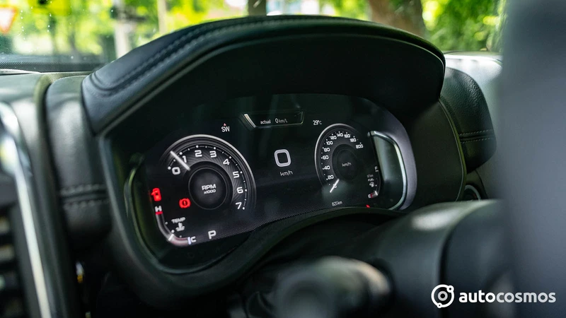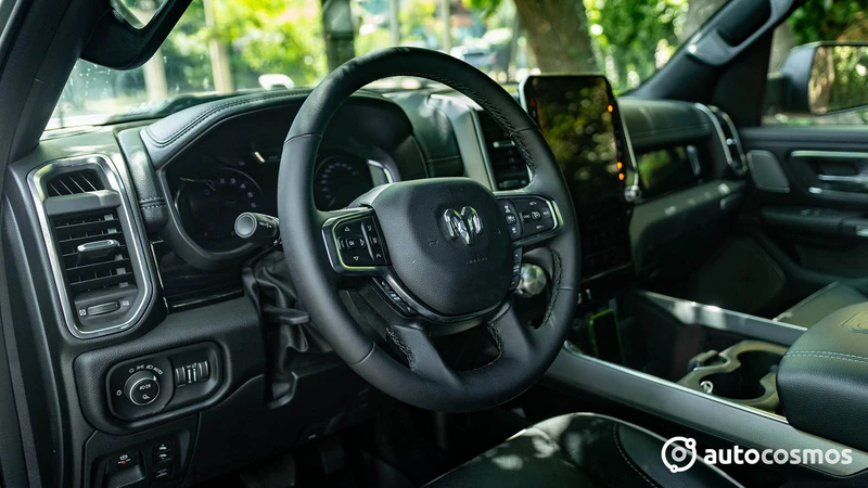La posición de manejo es alta, pero muy configurableincluyendo ajustes en dos ejes para el volante y eléctricos para los pedales. La RAM 1500 siempre ha tenido esa impronta de "camión" y se nota al ver la trompa voluminosa, que también puede eclipsar un peatón o un ciclist en incluso a un citycar. Para compensar el defecto, los espejos cuentan con retrovisor normal y gran angular, además de posibilidad de estirarlos, todo de manera eléctrica.