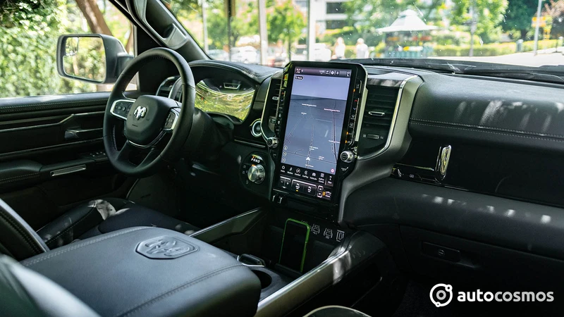 El selector de la transmisión y la tracción, está en un módulo separado con una perilla, lo que libera un gran espacio en la consola central donde encontramos los cargadores inalámbricos, 7 puertos USB y un enorme cubículocon bandeja móvil, posavasos y uno de los tantos "easter eggs" de RAM, que es un gráfico de conversiones bajo el apoyabrazos.