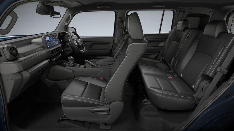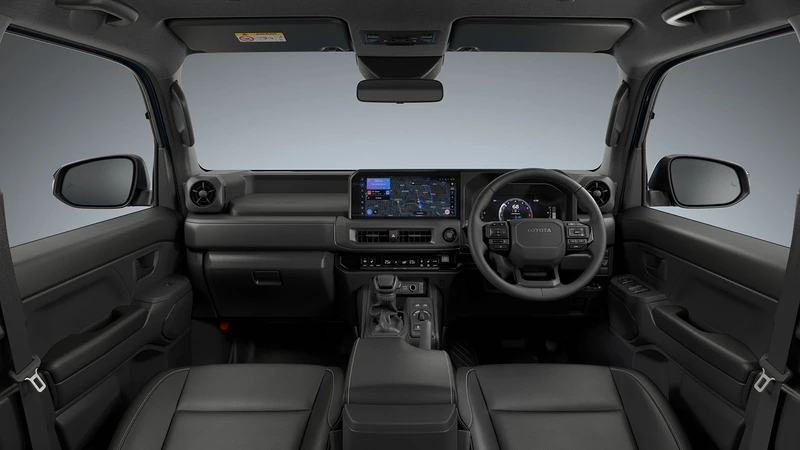 El interior sigue los lineamientos que vemos en otros modelos de la familia Land Cruiser, e incluso es bastante similar a lo que se vio en las filtraciones de la próxima Hilux, con una distribución horizontal, ergonómica y donde todo sea fácil de encontrar o de usar, para minimizar la distracción ocular.