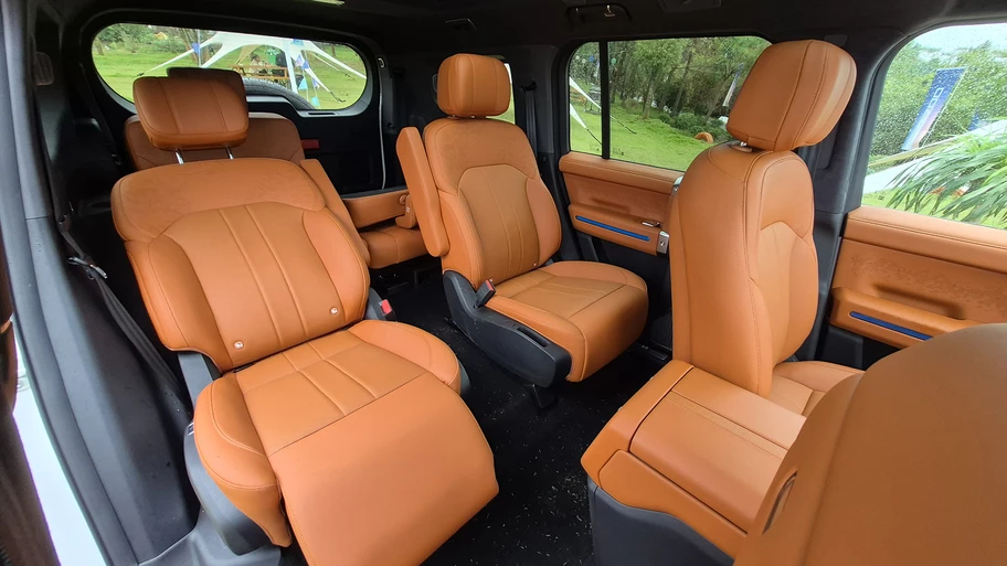 El G700 puede venir en dos configuraciones, una de 5 asientos con un baúl inmenso o una de 6 plazas con tres filas de dos asientos cada una. En el caso 2+2+2, las butacas traseras se pliegan o despliegan eléctricamente, pero lo lindo vino en la fila del medio.